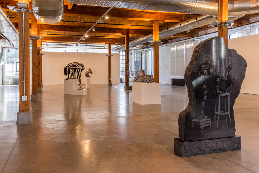 Upon entry on the main floor, the first sculpture in sight is Sculpture Bidon, an upright granite slab with a laser image printed on each side. Both images feature a woman bent over with her legs propped on a stool and a chair, her body decorated with geometric forms. On one side of the granite, there is a hammer on her head. On the other, what looks like a bag sits on her back. While somewhat comical at first glance, the print seems to grow heavier the longer it is looked at, as the hammer and bag seem to weigh down this hunched, stretched woman. Sculpture Bidon introduces many integral aspects of the show, such as the prominence of angular geometric designs, the motif of the hammer, and the use of chairs as props. It is a perfect welcome to the world of Blass, featuring seemingly random inanimate objects in an absurd and humorous, yet also unsettling, way.