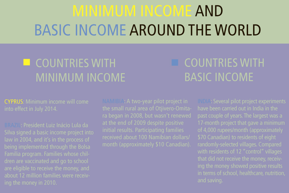 In October 2013, the Basic Income Initiative in Switzerland submitted 126,000 signatures in favour of its proposal for each resident to receive an unconditional basic income of 2,500 Swiss francs a month (or $3,072 in Canada). Unconditional basic income is exactly what it sounds like: the proposed project would provide each recipient with an amount deemed sufficient for survival, without consideration of participation in the workforce. The number of signatures collected in the Swiss case surpassed the 100,000 needed to call a national referendum, so the unconditional basic income proposal will be put to a vote. No date has yet been announced, but laws stipulate it must take place within two or three years.