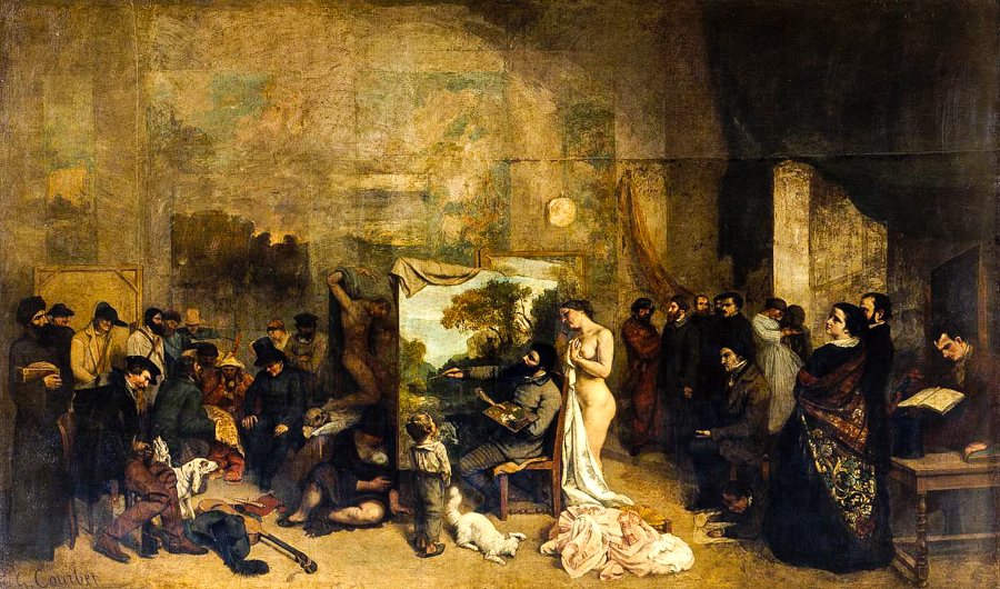 Monkman’s works often engage with the political, social, and sexual aspects of the identity and history of Indigenous people in Canada. True to his practice, “Welcome to the Studio” explores Indigenous identities, past contact with settlers, and the construction of historical narratives by superimposing figures from the Notman collection onto the arrangement of Courbet’s Painter Studio. Monkman portrays himself in the place of Courbet, but in the garb and pose of William Notman’s own famous self-portrait. Unavoidably, this compositional representation ties Monkman to the two other men, while raising questions of his identity as an artist and an individual of Cree descent.